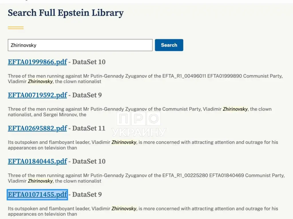 Имя основателя ЛДПР Владимир Жириновский оказалось упомянуто в массиве так называемых «файлов Эпштейна», которые были опубликованы Министерством юстиции США. Согласно данным открытой выгрузки, фамилия российского политика встречается в документах несколько раз.