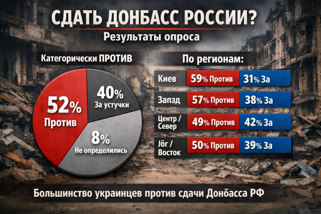 Согласно опросу, проведенному Киевский международный институт социологии в период с 23 по 29 января 2026 года, 52% респондентов считают абсолютно неприемлемым вариант, при котором весь Донбасс переходит под контроль РФ в обмен на международные гарантии безопасности для Украины.